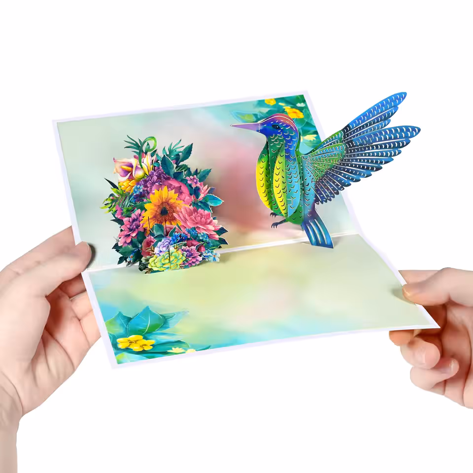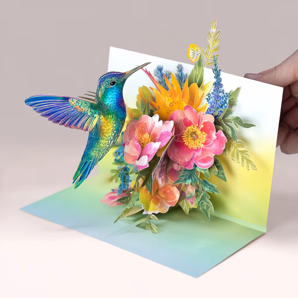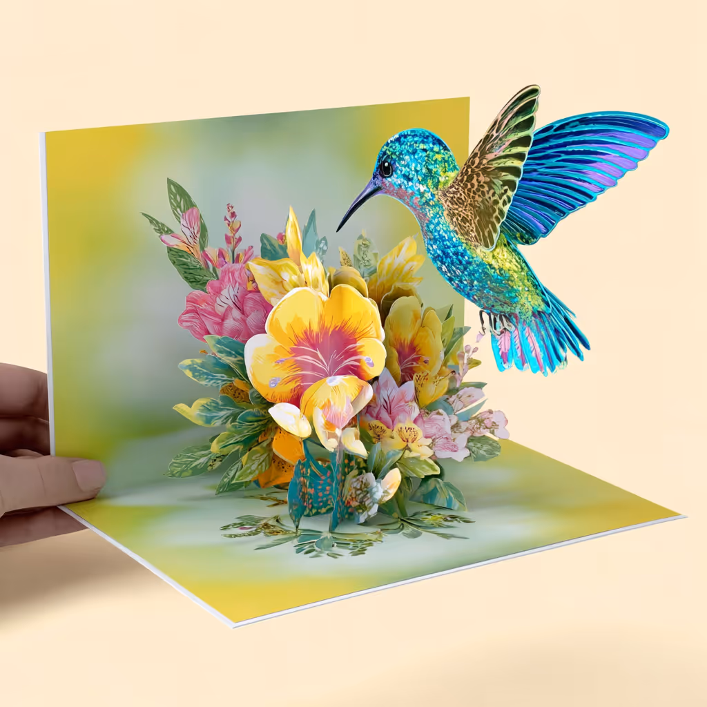 Unsere handgefertigten 3D-Kolibri-Karten verwandeln deine Botschaft in ein unvergessliches Erlebnis. Beim Öffnen entfaltet sich ein kunstvoll gestalteter Kolibri – Symbol für Freude, Leichtigkeit und kostbare Momente.